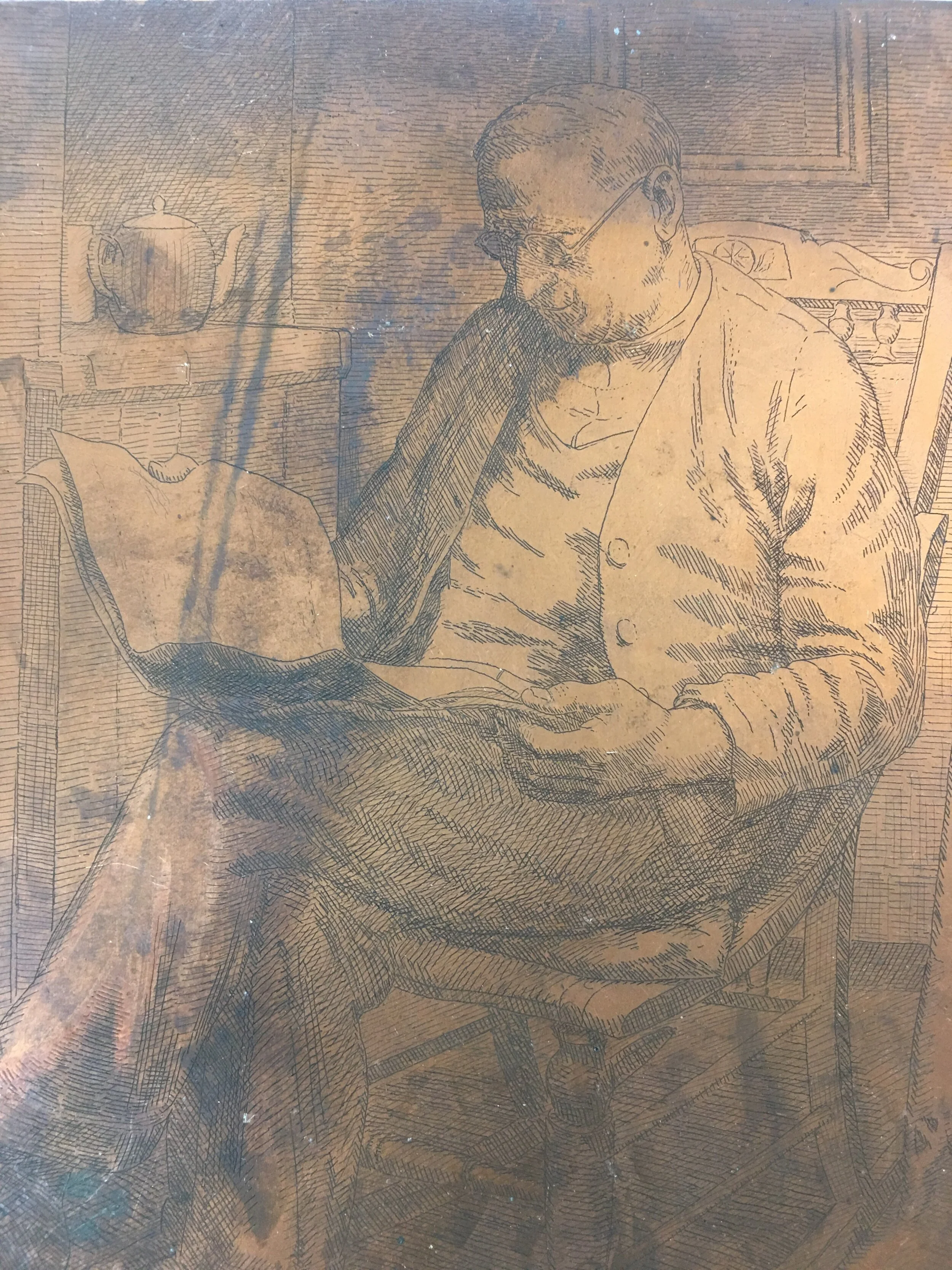 Drypoint is a process that refers to the ink being recessed into lines of a plate which are made of copper zinc or metal. Once the ink has been pushed into the line of a plate or matrix is then put through an etching press with paper and the pressure of the press embeds the paper into the inked lines below the surface allowing the ink to transfer from the plate to the paper.